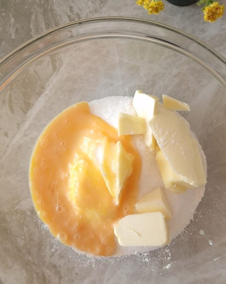 In einer Schüssel das Mehl, das Backpulver, die Eier und die kalte Butter geben.