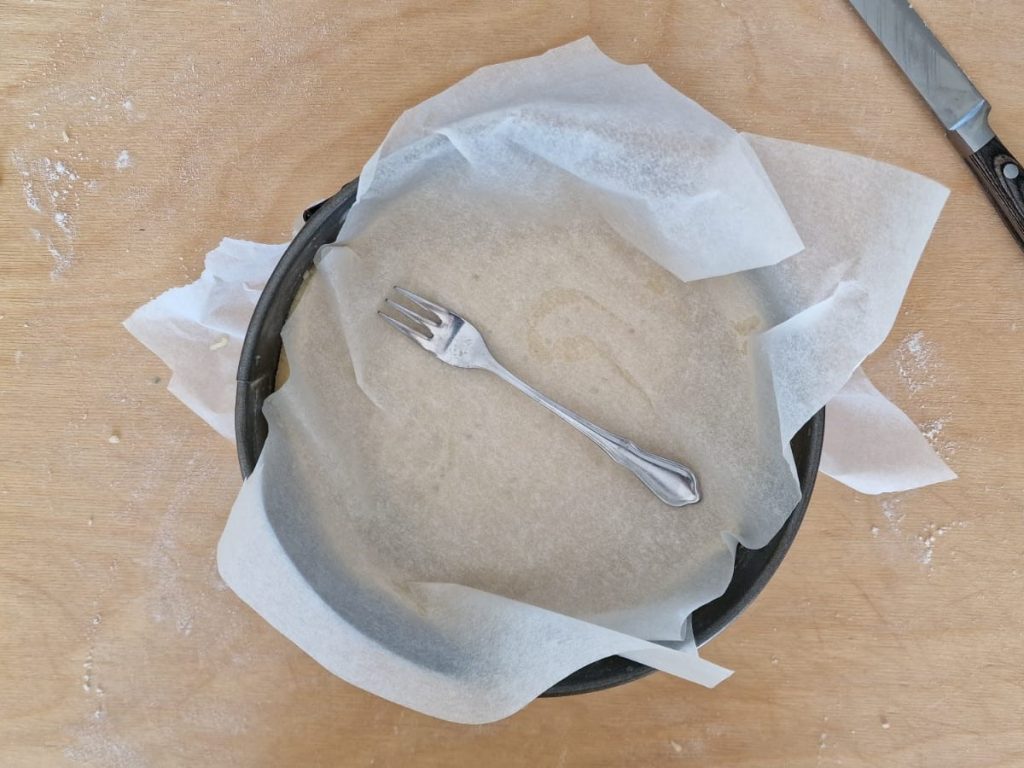 Legen Sie den Teig in eine gefettete und bemehlte Springform von 18-20 cm. Dann stechen Sie mit den Zinken einer Gabel ein.