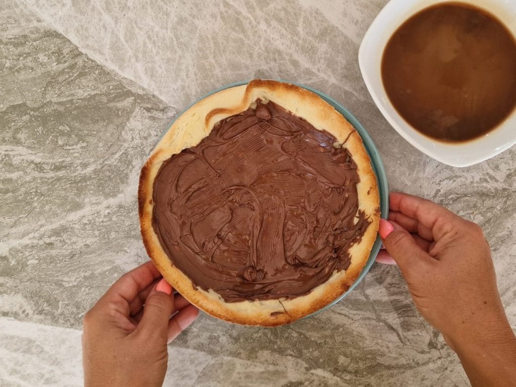 Bestreichen Sie die Mürbeteigbasis mit 1 Esslöffel Nutella und tauchen Sie die Löffelbiskuits in den Milchkaffee.