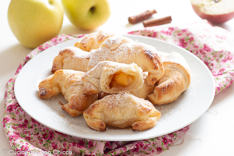 Schnelle Apfelhörnchen, einfache Häppchen ähnlich wie Apfelstrudel. Ich empfehle auch den Apfelkuchen ohne Waage und den Apfelkuchen mit Rosinen zu probieren. Die schnellen Hörnchen werden mit fertigem Blätterteig zubereitet, bequem und vielseitig, sie präsentieren sich mit schönen halbmondförmigen Päckchen, während das Herz des Desserts eine Füllung aus Äpfeln und Zimt ist. Wenn Sie möchten, können Sie auch einen Teelöffel Aprikosenmarmelade hinzufügen, und für einen Hauch von Knusprigkeit können Sie gehackte Nüsse hinzufügen. Nach dem Backen können Sie sie großzügig mit Puderzucker bestäuben.