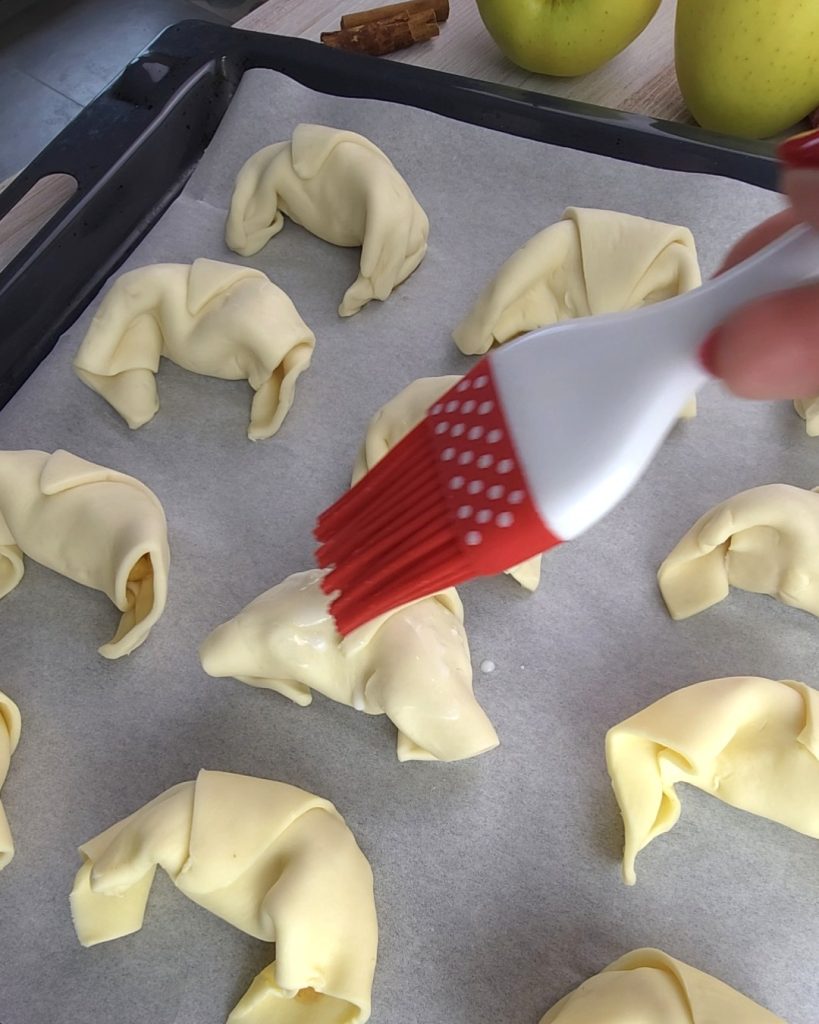 Legen Sie alle Hörnchen auf ein mit Backpapier ausgelegtes Backblech und bestreichen Sie sie mit Milch.