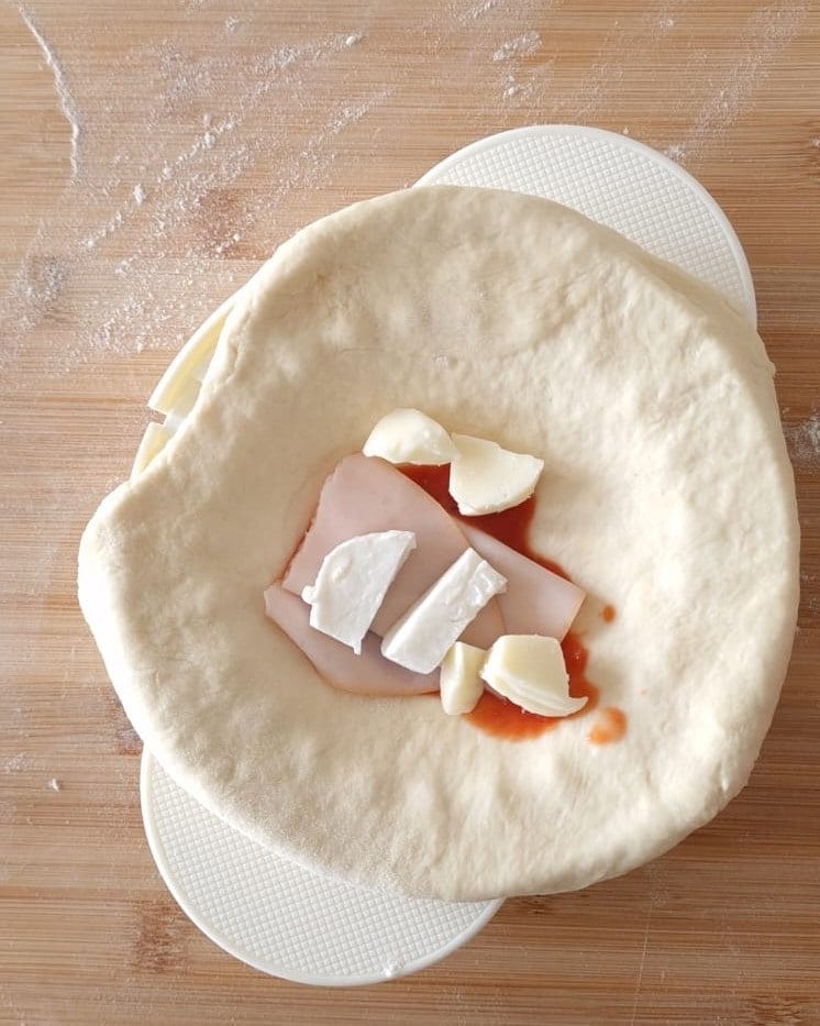 Mit einem entsprechenden Werkzeug oder einem einfachen Ausstecher formen Sie Kreise, in deren Mitte Sie mit gewürfeltem Käse, gewürzter Tomate und gekochtem Schinken füllen. Den übrigen Teig aufbewahren, um weitere Calzoni zu machen.