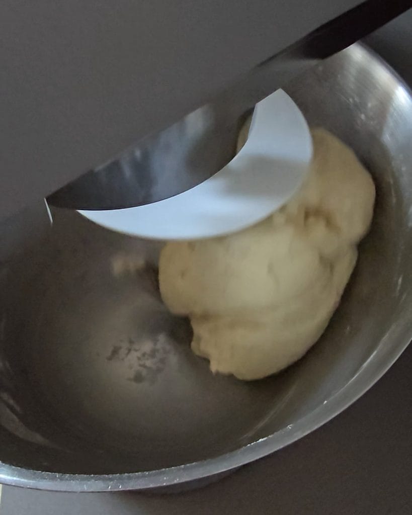 Gießen Sie die Milch und die restlichen Zutaten hinzu, dann kneten Sie gut, bis sich ein kompakter Ball gebildet hat.