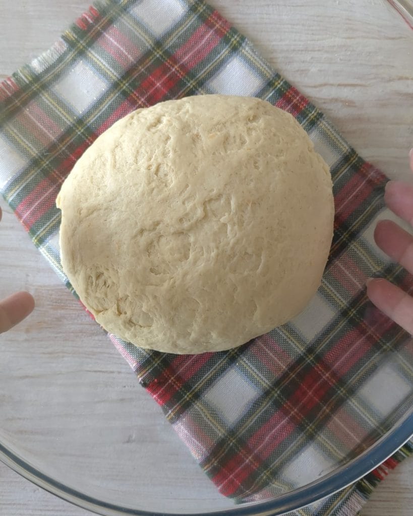 Übertragen Sie den Teig auf die Arbeitsfläche und kneten Sie ihn mit den Händen, dann lassen Sie ihn in einer Schüssel mit Frischhaltefolie abgedeckt etwa 2 Stunden gehen.