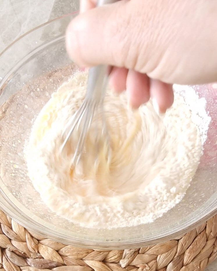 Milch und Öl eingießen, dann das Mehl und das Backpulver unterrühren.