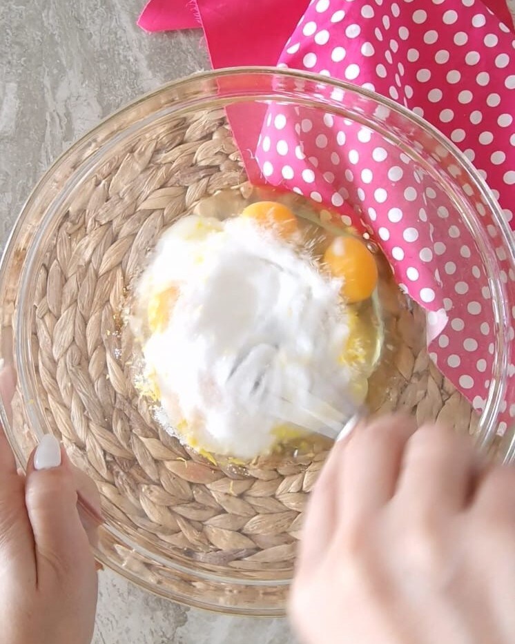 In einer Schüssel die Eier mit dem Zucker und der geriebenen Zitronenschale aufschlagen.