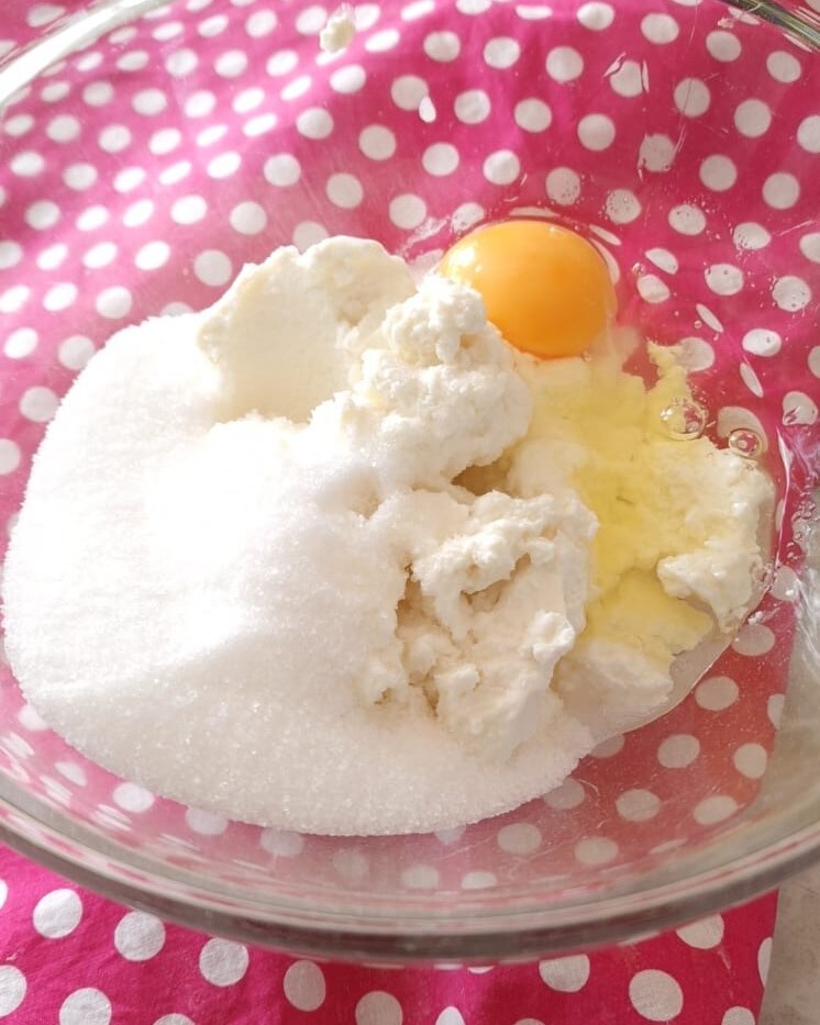 In einer Schüssel die Ricotta mit dem Zucker, dem Vanillin und dem Ei zu einer Creme verarbeiten.