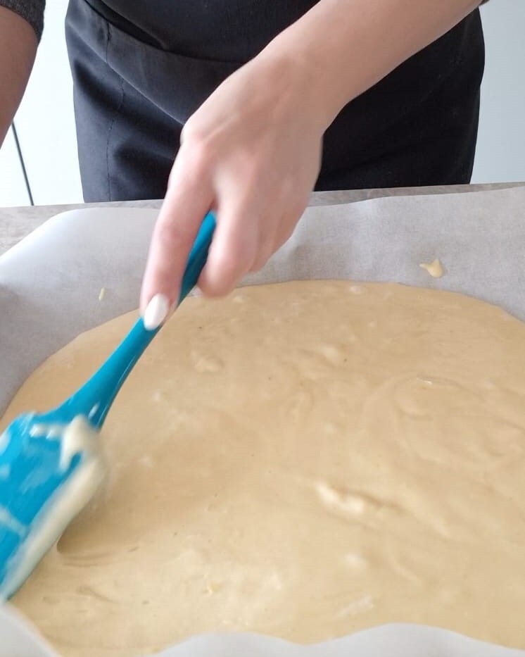 Den Teig in eine mit Backpapier ausgelegte Form 30cm x 20cm gießen,