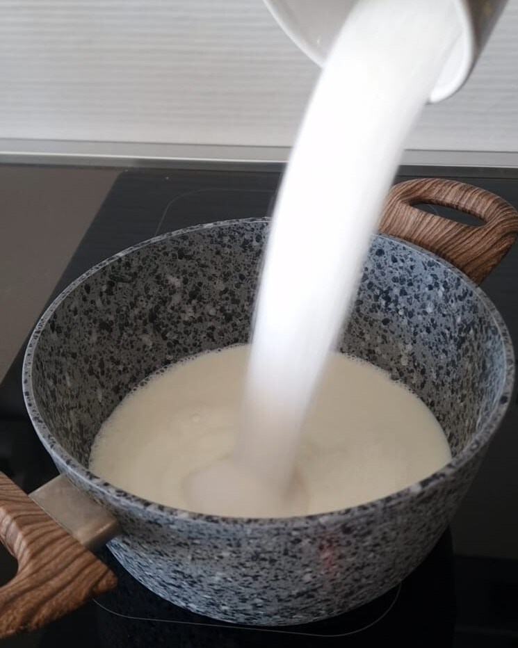 In einem Topf 3/4 der Milch und den Zucker geben, auf den Herd stellen und zum Siedepunkt bringen.
