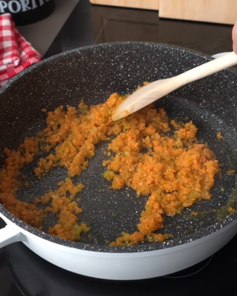 Sellerie, Möhre und Zwiebel fein hacken und in einer Pfanne mit etwas Öl anschwitzen.