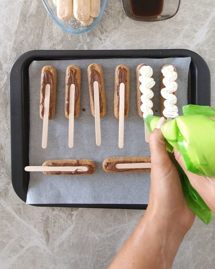 Füllen Sie mit einem Teelöffel Nutella, und fügen Sie den Stiel hinzu, dann füllen Sie mit Hilfe eines Spritzbeutels die zuvor geschlagene Sahne ein.