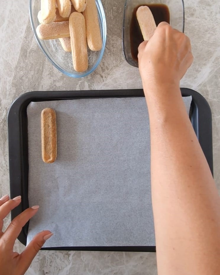 Nehmen Sie die Hälfte der Löffelbiskuits und tauchen Sie sie nur auf der Innenseite und nur für einen Moment in den Kaffee, achten Sie darauf, sie nicht zu sehr aufzuweichen.