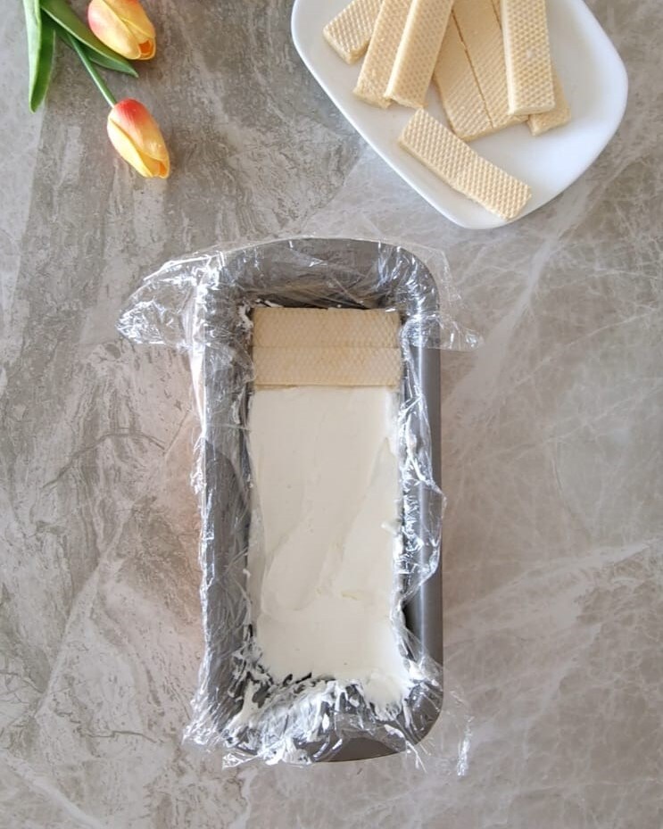 Fahren Sie mit einer ersten Schicht mit Milch getränkten Waffeln fort. Machen Sie eine weitere Schicht Creme und so weiter, bis die Zutaten aufgebraucht sind.
