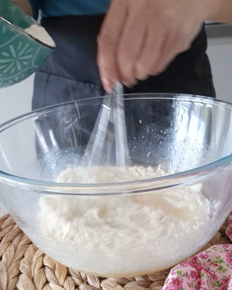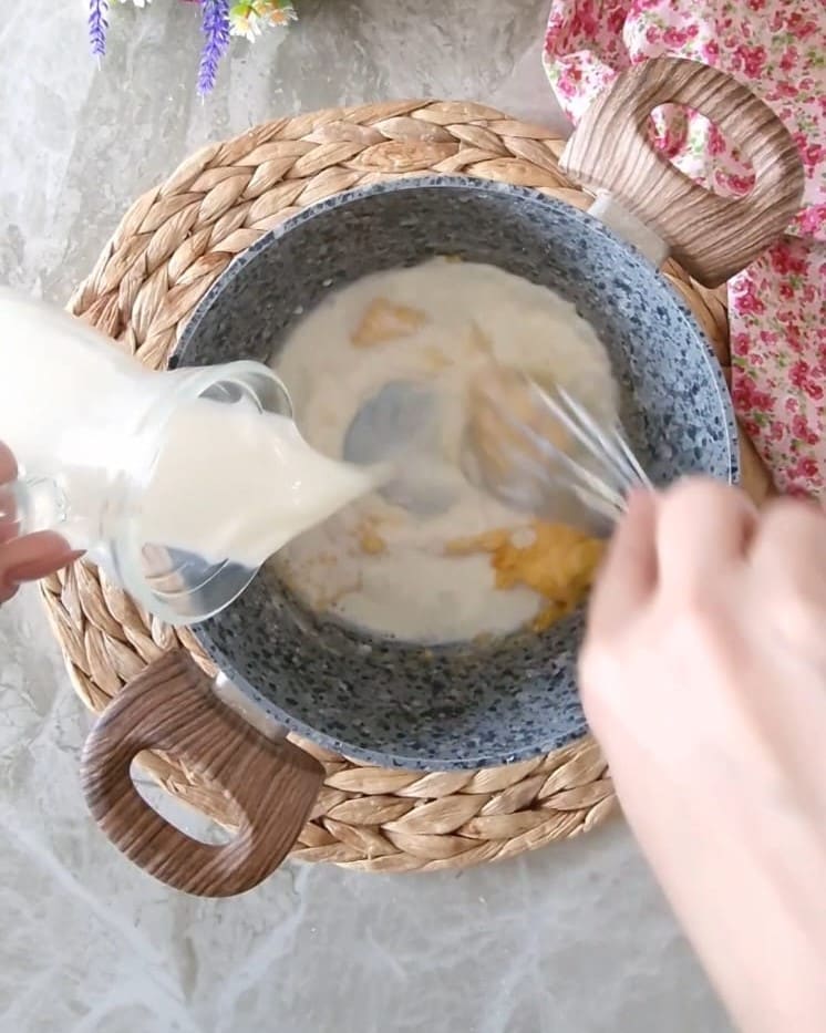 Zuerst die Crème vorbereiten, die gut abkühlen muss: Schlagen Sie das Ei mit dem Zucker, dann das gesiebte Mehl hinzufügen