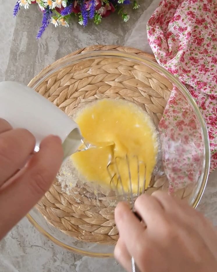 Dann das Öl und die Milch hinzufügen und mit einem Schneebesen mischen.