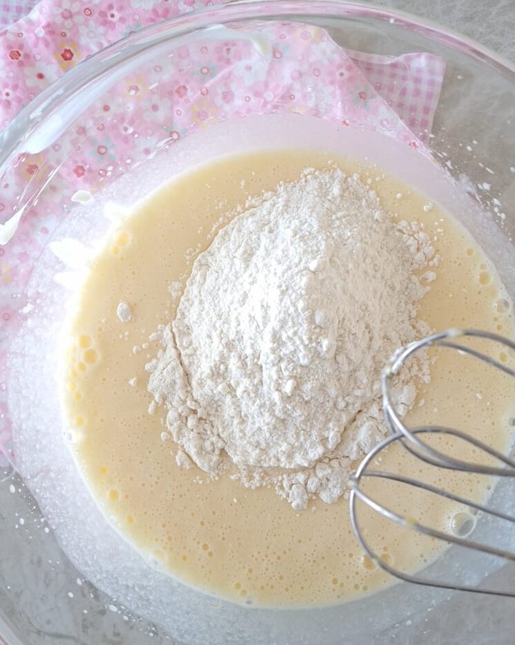 Ein Glas Kartoffelstärke und zwei Gläser Weizenmehl 00 einarbeiten, gut umrühren und dann das gesiebte Backpulver hinzugeben, bis ein glatter und homogener Teig ohne Klumpen entsteht.