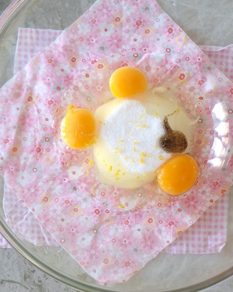 In einer Schüssel die Eier mit Zucker, geriebener Zitronenschale und Vanilleessenz schlagen.