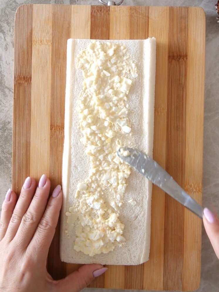 Nehmen Sie jetzt eine Servierplatte und legen Sie die erste Scheibe Toast darauf und bestreichen Sie sie mit der hartgekochten Eiersauce, dann legen Sie eine weitere Scheibe darauf.