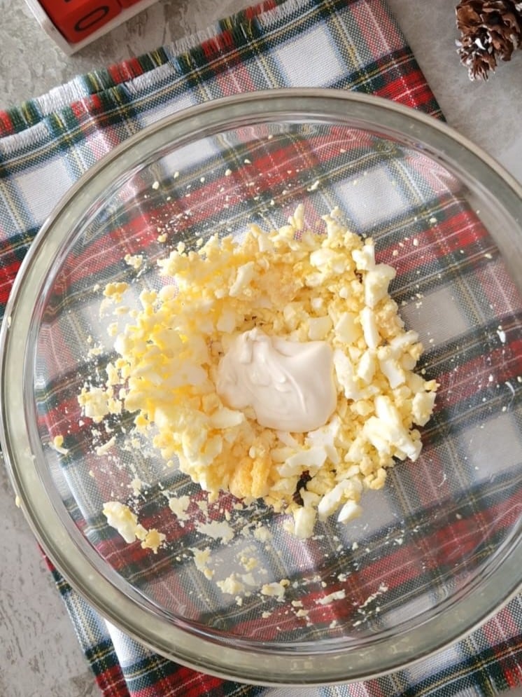 Beginnen Sie damit, die Sauce mit hartgekochten Eiern so zuzubereiten: Eier in reichlich Wasser kochen. Sobald es zu kochen beginnt, 9 Minuten kochen lassen, in kaltem Wasser abkühlen, dann schälen und zusammen mit der Mayonnaise in eine Schüssel geben.