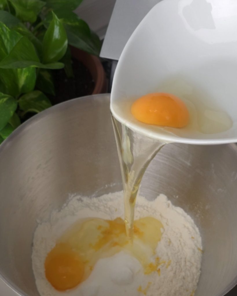 • Einmal alles zusammengefügt, auf ein Nudelbrett übertragen und kneten, bis ein weicher und kompakter Teig entsteht. Den Teigklumpen halbieren und in Frischhaltefolie wickeln, dann im Kühlschrank für 1 Stunde ruhen lassen.