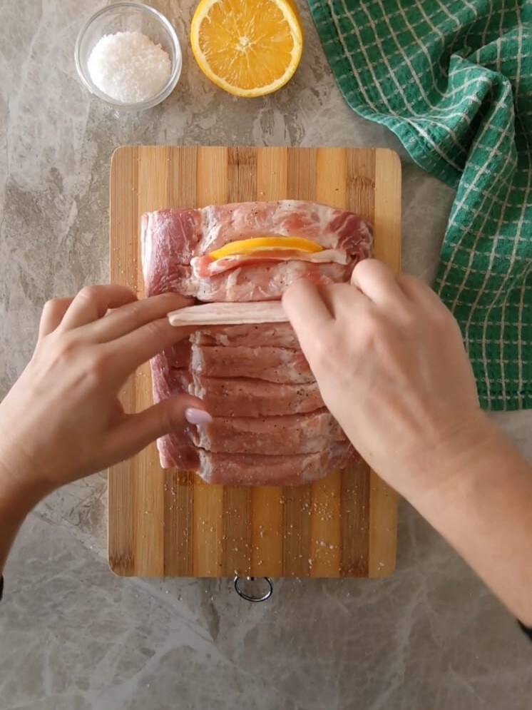 Legen Sie in jede Tasche zwei dünn geschnittene Orangenscheiben und eine Scheibe Bauchspeck.