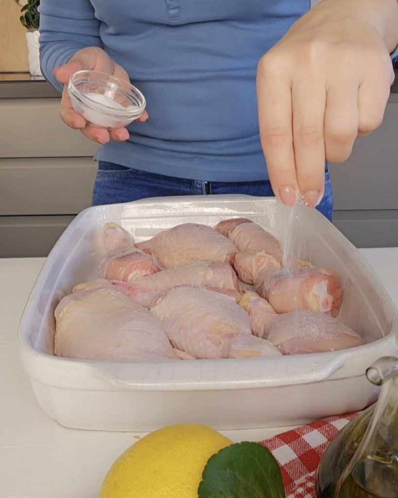 Nehmen Sie die Hähnchenschenkel und würzen Sie sie mit Salz, Pfeffer und Knoblauchpulver, dann schneiden Sie die Zitrone in Scheiben.