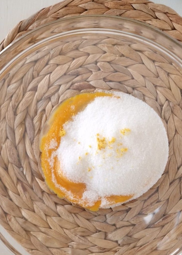 Trennen Sie das Eigelb vom Eiweiß, schlagen Sie das Eiweiß steif und stellen Sie es beiseite. Fügen Sie dem Eigelb Zucker und Zitronenschale hinzu und schlagen Sie es dann mit dem elektrischen Handmixer.