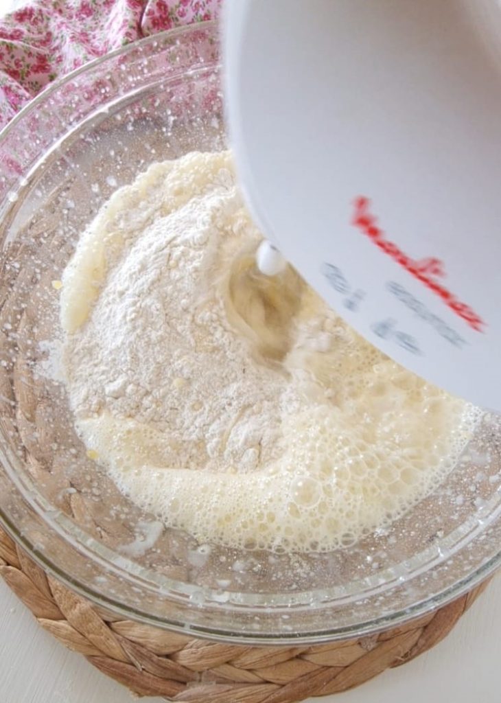 Fügen Sie das gesiebte Mehl und Backpulver hinzu.