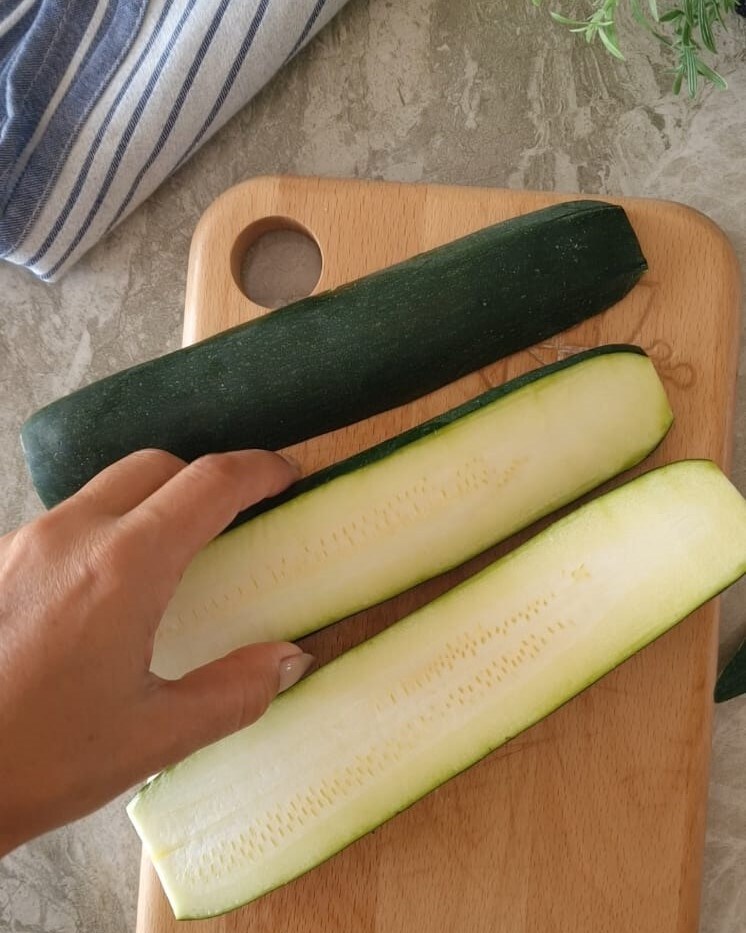 Waschen und enden Sie die Zucchini, dann schneiden Sie sie horizontal in Scheiben von etwa einem halben cm Dicke.