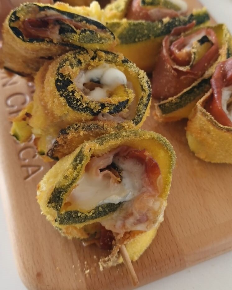 Zucchini-Spieße mit Rohschinken, ein einfaches und schnelles Gericht, ähnlich wie die Zucchini-Spieße aus dem Ofen. Für eine alternative Version probieren Sie auch die Zucchini-Spieße mit Lachs und Mozzarellakugeln. Das heutige Rezept ist ebenso köstlich und in wenigen Schritten zubereitet! Ein Rezept mit garantiertem Erfolg, Sie müssen die Zucchini panieren und mit Rohschinken und Scamorza füllen, dann aufrollen und auf die Spieße stecken. Sie sind ein leckeres Gericht, dem niemand widerstehen kann, und ich bin sicher, sie werden der ganzen Familie gefallen.