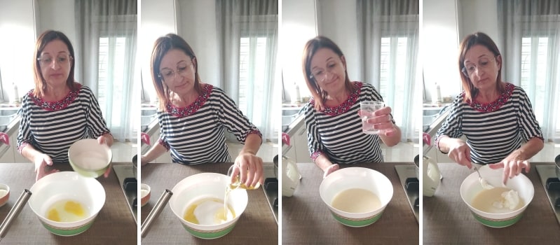 – In eine andere Schüssel Eier und Zucker geben; dann Öl, Wasser und Joghurt hinzufügen und kurz umrühren.