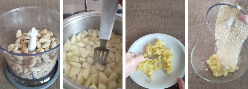 – In der Zwischenzeit die Mandeln mahlen und fast zu Mehl verarbeiten. Wenn die Äpfel gar sind (prüfen, ob die Gabelspitzen die Stückchen leicht einstechen), diese mit einer Gabel zerdrücken (oder pürieren) und zu einem Brei verarbeiten. Dann den Apfelbrei und die zerkleinerten Mandeln vermengen.