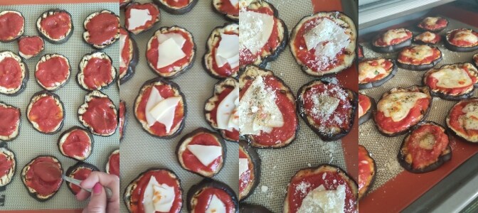 – Die Auberginenscheiben auf ein geöltes Aluminiumblatt oder eine Silikonmatte legen (Backpapier wird nicht empfohlen, da es unter dem Grill verbrennt) und mit Tomatensauce, geräuchertem Provola-Käse, getrocknetem Oregano und Parmesan belegen. Mit etwas Öl beträufeln und unter dem Grill des Ofens backen, bis der Mozzarella eine köstliche Kruste bildet.