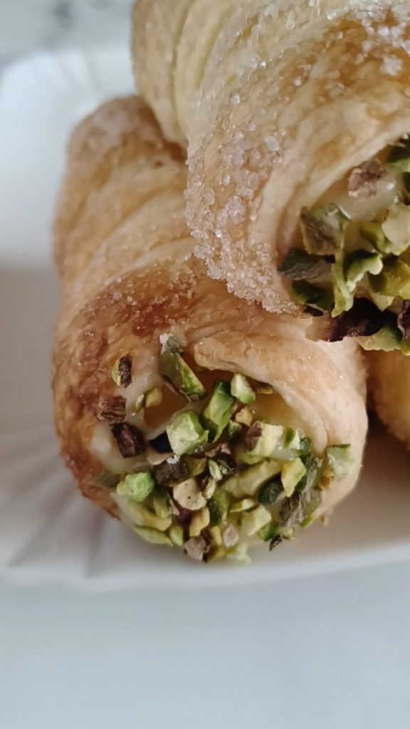 Aus dem Ofen nehmen, warten, bis die Blätterteigrollen abgekühlt sind, und mit einer leichten Drehung die Rollen entfernen. Die abgekühlten Rollen mit der vorbereiteten Creme füllen.