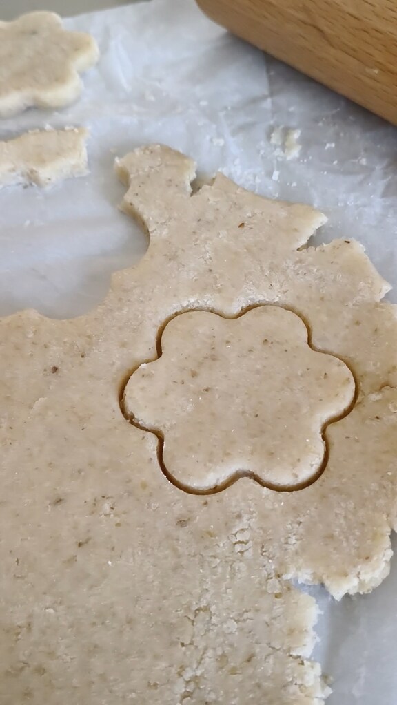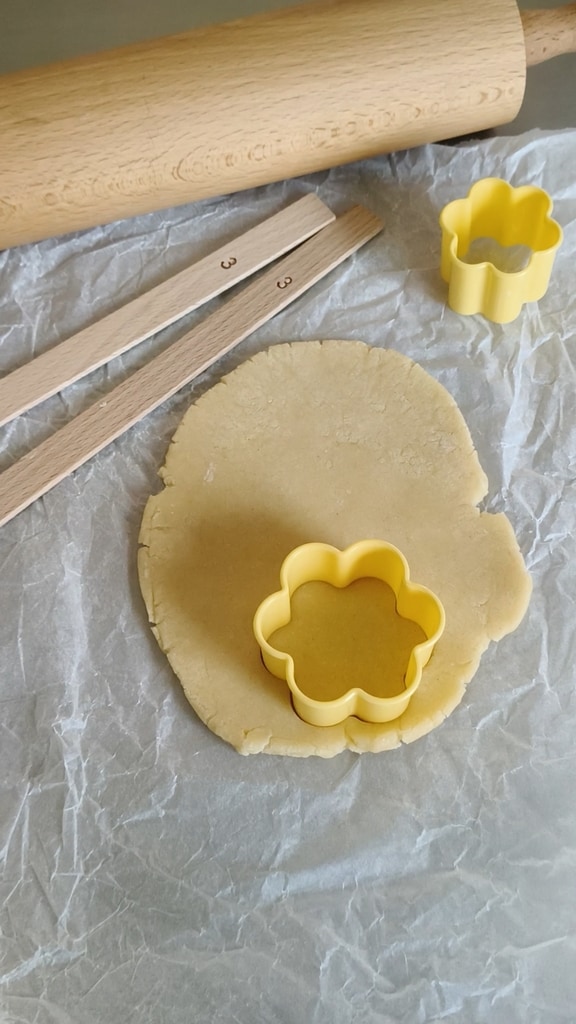 • Den weißen Mürbeteig auf eine Dicke von 3 mm ausrollen und mit den Formen ausstechen.