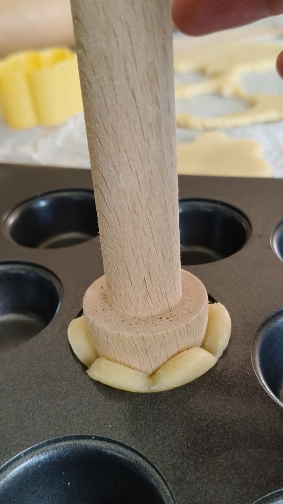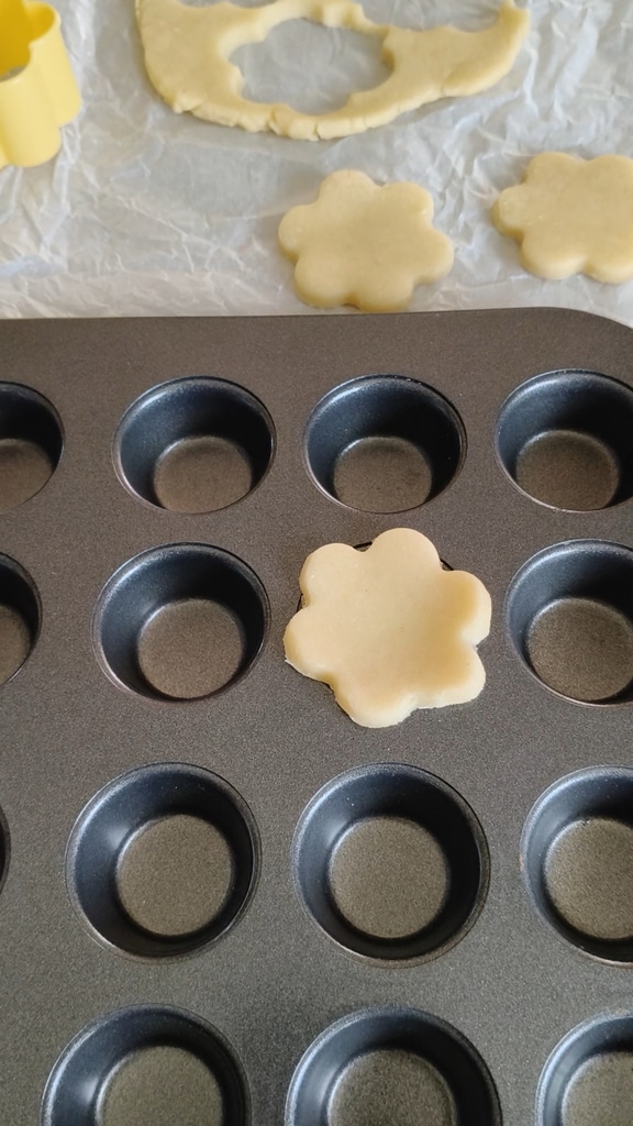 • Die Mürbeteigblumen auf die Vertiefungen der Törtchenformen legen, ohne zu fetten.