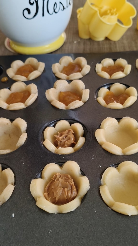 Und genau das ist passiert, als ich dieBlüten von Mürbeteig Köstlichkeiten gemacht habe: Ich hatte im Gefrierschrank sowohl den übrig gebliebenen Mürbeteig, nachdem ich die Herzkekse mit Äpfeln gemacht habe, als auch den mit Haselnüssen. Also habe ich mit Konfitüren, Nüssen und Aufstrichcremes ein schönes Tablett mit Mini-Törtchen gemacht, das ich dann mit meinen Kollegen im Büro geteilt habe.