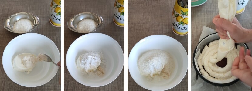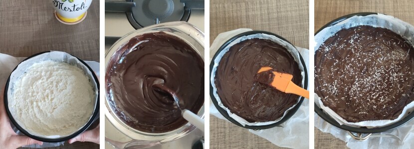 – Während die Basis abkühlt, den Frischkäse, Ricotta, Puderzucker und Kokosraspeln in die Schüssel geben. Die Zutaten gut mit einem Spatel mischen und dann die Mischung in den Spritzbeutel füllen, die Spitze abschneiden und kreisförmig auf die Basis drücken. (Wenn Sie keinen Spritzbeutel haben, gehen Sie auf traditionelle Weise vor und versuchen Sie, die Käsecreme gut zu glätten)