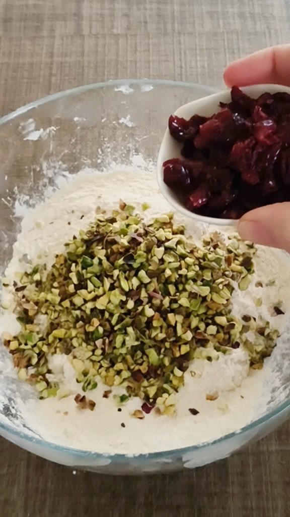 Mehl, gehackte Pistazien und getrocknete rote Früchte hinzufügen. Der Teig ist leicht zu verarbeiten und in wenigen Minuten kompakt.