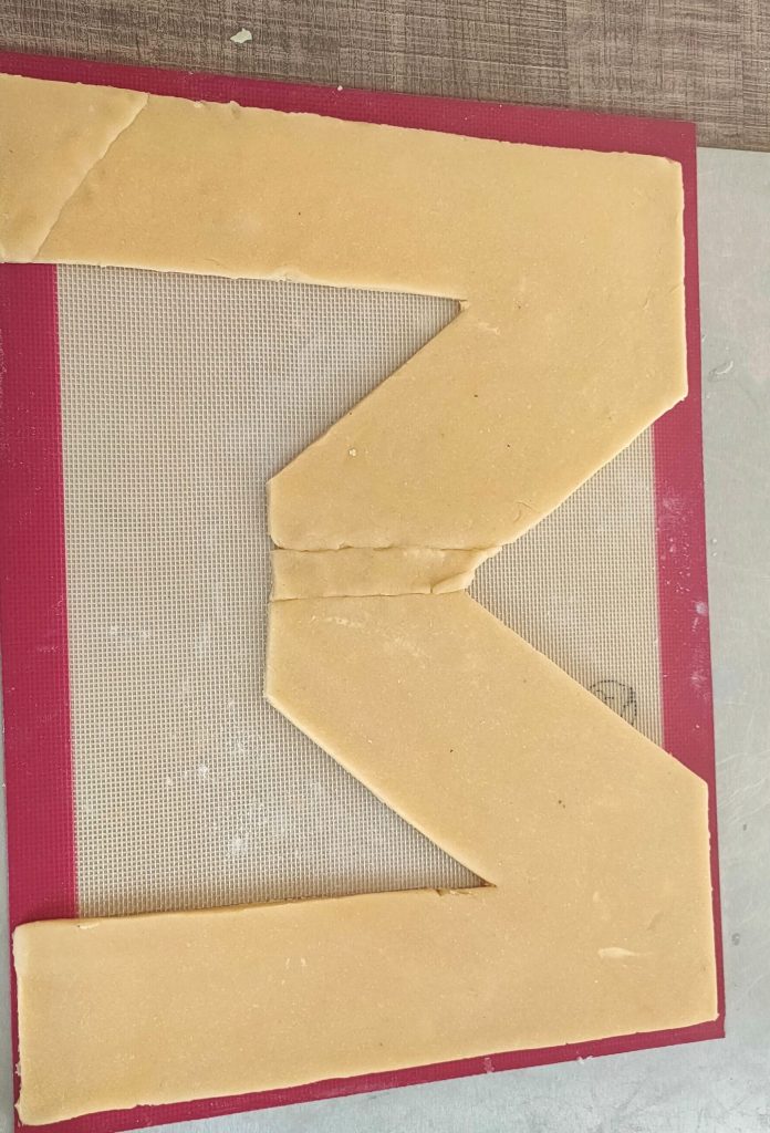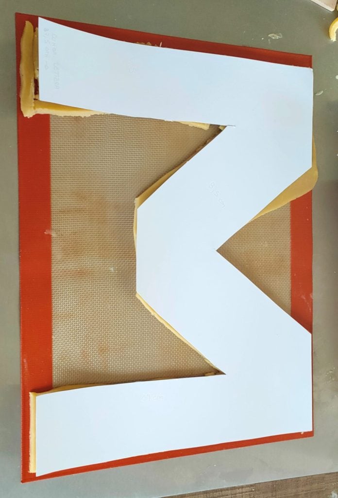 Nachdem ich die Schablone in der idealen Größe erstellt hatte (sucht auf Google), habe ich sie ausgedruckt und zur Einfachheit auf Karton übertragen, den Teig ausgerollt und zwei M’s ausgeschnitten.