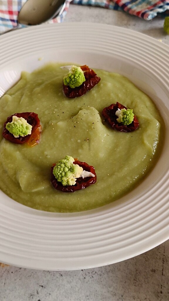 Kurzum, ein gutes Gericht, diese Cremesuppe mit Romanesco-Brokkoli und getrockneten Tomaten, und ich bin sicher, dass sie euch ebenso gut schmecken wird.
