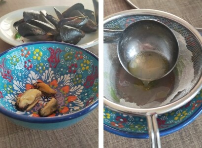 – Nachdem die Muscheln gewaschen, gereinigt und vom Bart befreit wurden, in einer Pfanne mit Öl, Knoblauch, Wein und Petersilie anbraten. Mit einem Deckel abdecken und sobald der Schaum entsteht, abschalten.