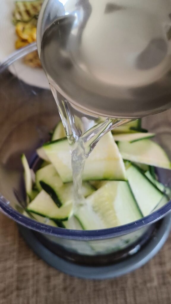 Zucchini waschen, die Enden abschneiden und in Stücke schneiden; in den Mixerbecher geben und mit Öl würzen.