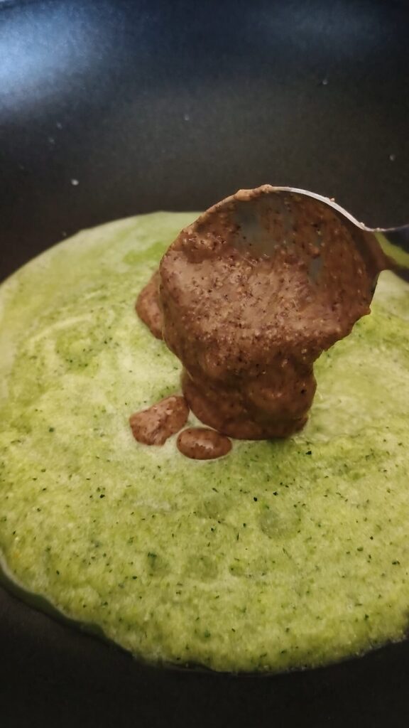 Mixe die Creme gut, bis sie glatt ist, dann erwärme sie ein paar Minuten in der Pfanne mit einem Schuss Öl.