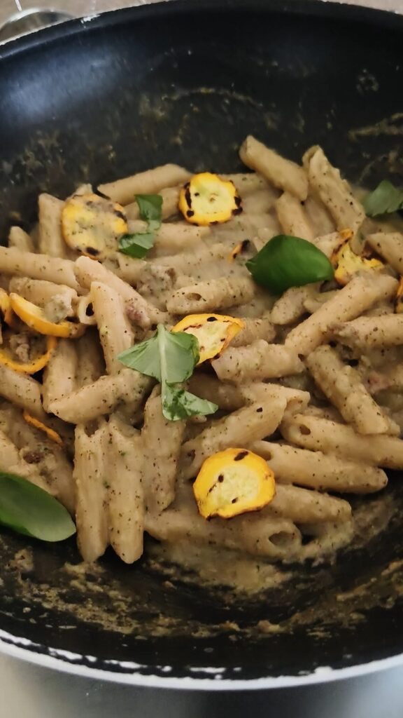 Um das Gericht optisch ansprechender zu machen und einen Kontrast in Konsistenz und Geschmack hinzuzufügen, habe ich gegrillte gelbe Zucchini auf die Pasta gegeben: Das Ergebnis ist nicht nur schön anzusehen, sondern auch köstlich.