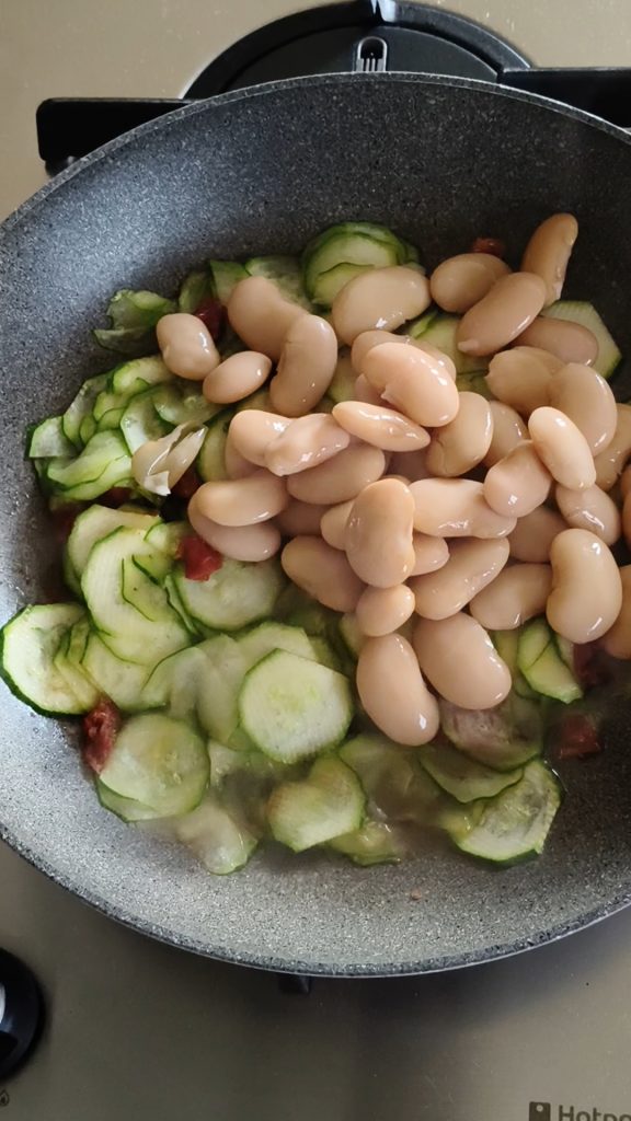 Nach etwa 5 Minuten sollten die Zucchini zart und nicht verbrannt sein. Die abgetropften und abgespülten Bohnen hinzufügen (einige für die Dekoration beiseitelegen); ein paar Minuten ziehen lassen, dabei immer etwas Wasser (oder Gemüsebrühe) hinzufügen, salzen und dann ausschalten.