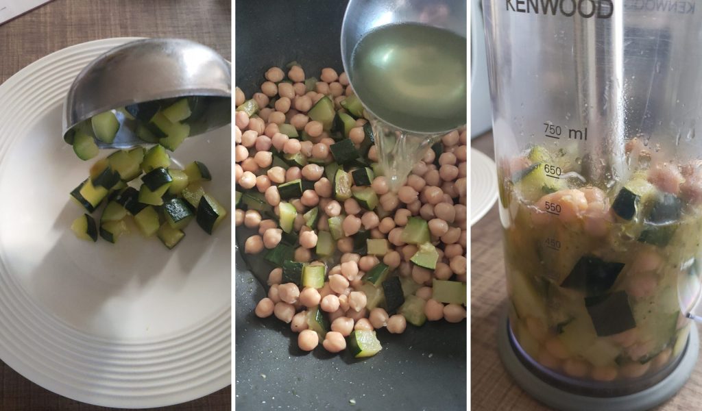 – Die Zucchini waschen, putzen und in Würfel schneiden. Einen Esslöffel Öl in der Pfanne mit dem Knoblauchpulver (oder der Knoblauchzehe) erhitzen, die Zucchiniwürfel hinzufügen und einige Minuten anbraten. Mit 2 Kellen heißer Gemüsebrühe ablöschen. Abdecken und etwa 5 Minuten kochen lassen.