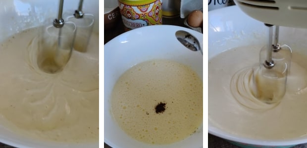 – Die Eier mit dem Zucker ca. 20‘ aufschlagen; in der Mitte des Schlagens können die Aromen hinzugefügt werden. Am Ende sollte die Masse fast weiß und verdreifacht im Volumen sein.