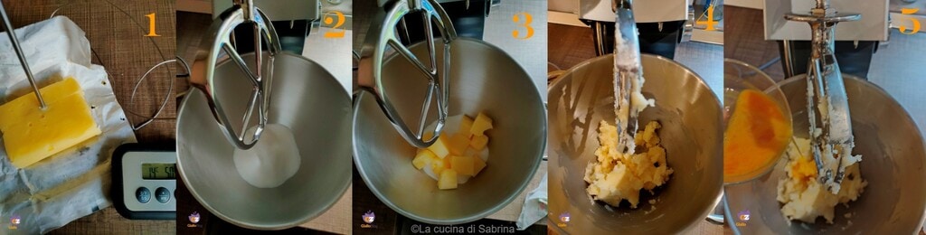 – 2,3,4 – In die Schüssel der Küchenmaschine den Zucker geben und bei niedriger Geschwindigkeit mit dem in Stücken geschnittenen Butter mischen, bis eine Creme entsteht.