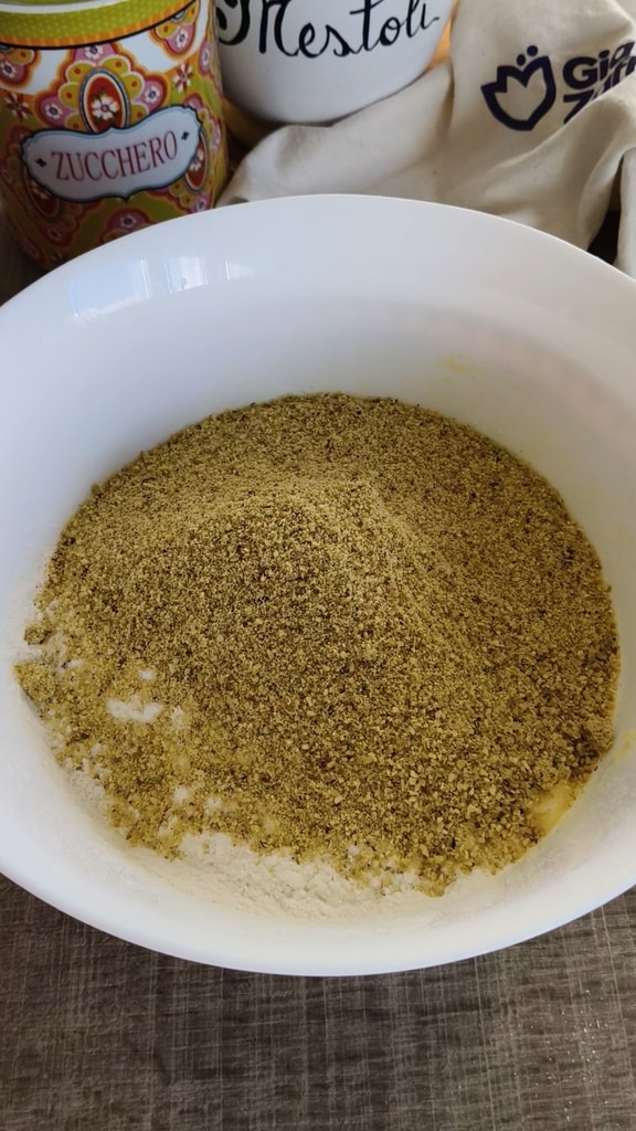 Wenige Zutaten, immer dieselben: Eier, Butter, Zucker und Mehl, dazu kommt das Pistazienmehl, das uns mit seinem Duft und seiner Farbe eine wirklich köstliche Basis schenkt.
